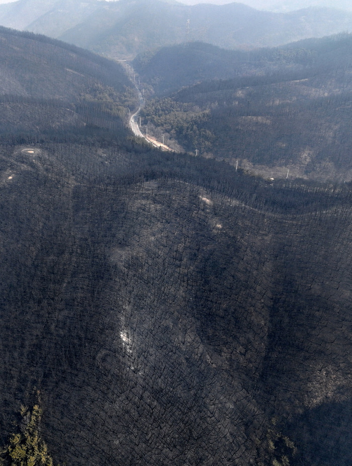 A burnt-out mountain is seen around a village in Uiseong, North Gyeongsang Province, southeastern South Korea, on March 26, 2025, after it was engulfed by a wildfire the previous day. (Yonhap)