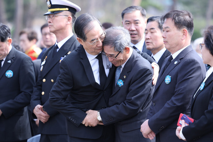 Acting President Han Duck-soo (L) comforts a bereaved family member of a late sailor at a national cemetery in the central city of Daejeon on March 28, 2025, during a ceremony to mark the 10th anniversary of the commemoration day for 55 troops who died in three major clashes with North Korea in the West Sea, comprising an inter-Korean naval skirmish in 2002, North Korea's torpedo attack on the corvette Cheonan in 2010 and its shelling of the border island of Yeonpyeong in the same year. Since 2016, the government has designated the fourth Friday of March as the commemoration day, known as the West Sea Defense Day. (Yonhap)