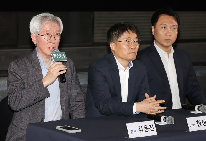 Kim Yong-jin (L), director of the documentary film "Search and Seizure: The Rise of an Insurrection," speaks during a publicity event in Seoul on April 14, 2025. The movie will be released in South Korea on April 23. (Yonhap)