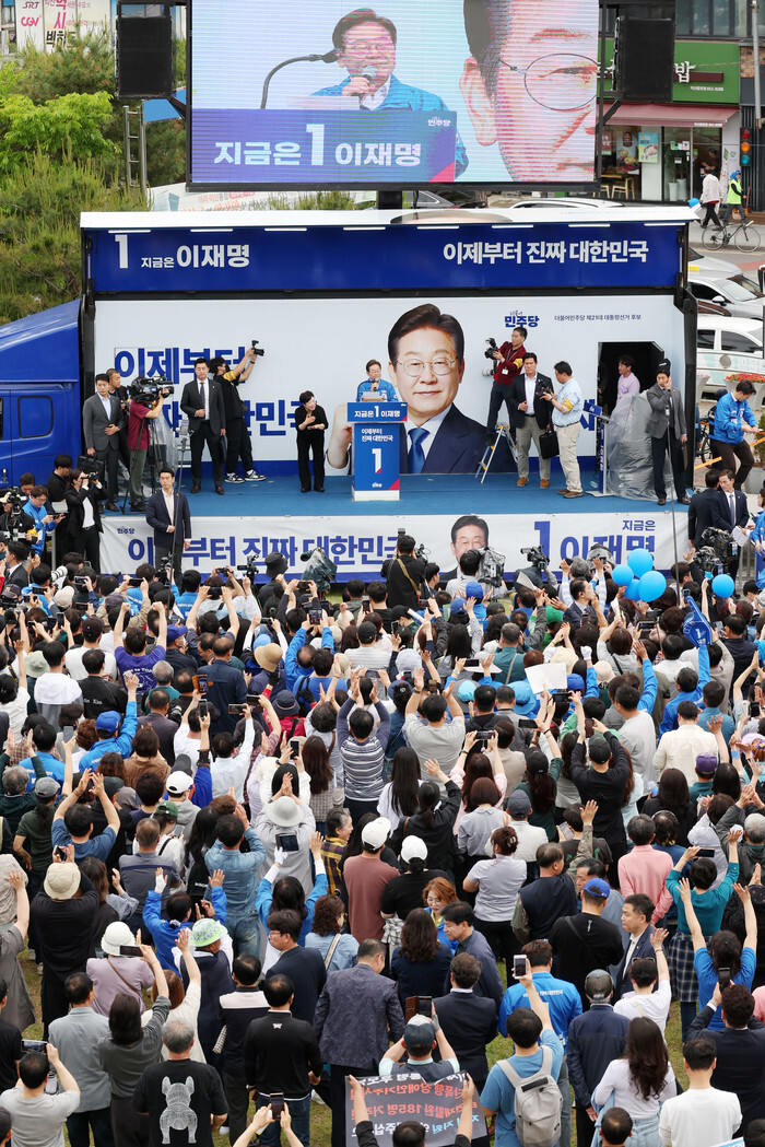 Lee Jae-myung (C, on stage), the presidential candidate of the liberal Democratic Party, makes a stump speech in Iksan, North Jeolla Province, southwestern South Korea, on May 16, 2025, ahead of the June 3 presidential election. (Pool photo) (Yonhap)