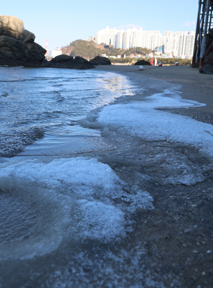 This photo, taken on Feb. 4, 2025, shows sea water frozen on the sand at Dadaepo Beach in the southeastern port city of Busan, as the country is gripped by a cold spell. (Yonhap)