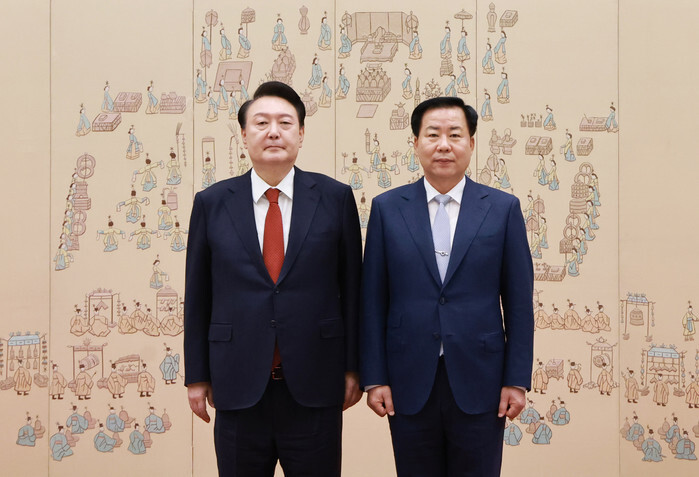 President Yoon Suk Yeol (L) poses with Sim Seung-seob after presenting him his credentials as the new South Korean ambassador to Australia at the presidential office in Seoul on Aug. 2, 2024. (Yonhap)
