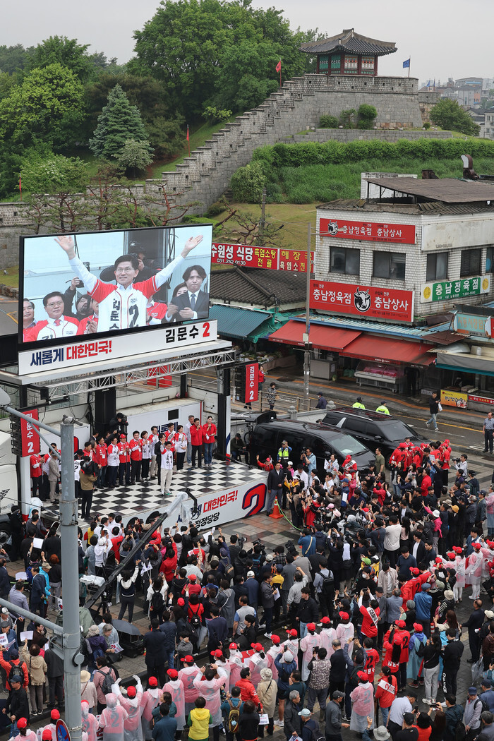 Kim Moon-soo (C, on stage), the presidential candidate of the conservative People Power Party, makes a stump speech at a traditional market in Suwon, south of Seoul, on May 16, 2025, ahead of the June 3 presidential election. (Yonhap)