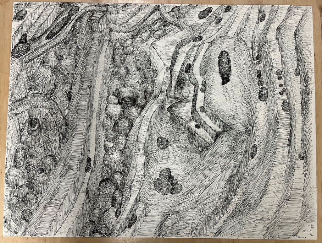 작가는 캔버스 위에 원하는 바탕 색상이 나올 때까지 여러 번 반복해서 칠을 하고 오방색을 중심으로 청색과 검정을 많이 사용하며 작업하고 있다.