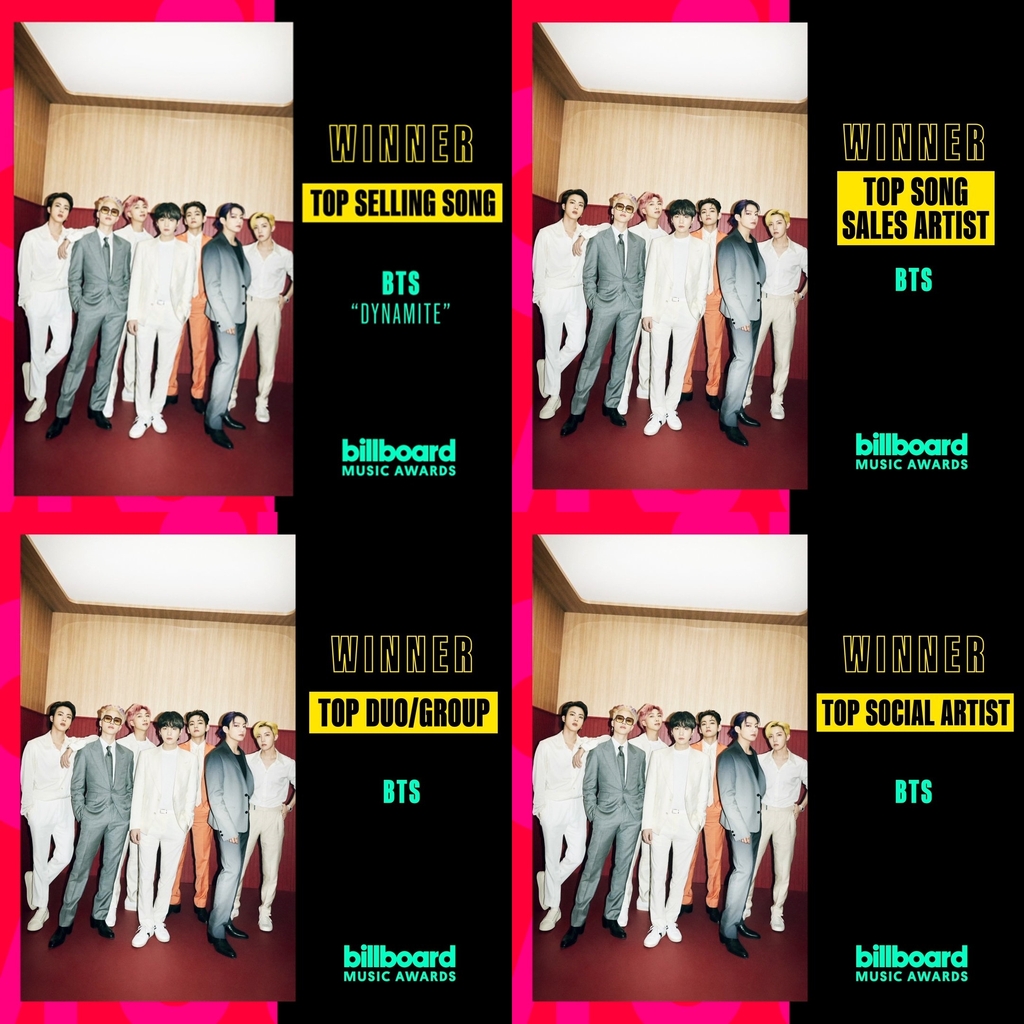 BTS는 빌보드 뮤직 어워즈에서 2관왕(2019년)이 기존 최고기록이었지만 올해는 후보에 오른 4개 부문에서 상을 모두 휩쓸며 자체 최다 수상기록을 썼다.