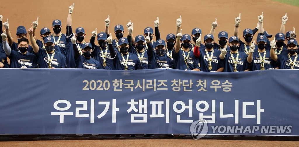 | ▲ 창단 첫 통합 우승 거두는 NC 다이노스 11월 24일 서울 구로구 고척스카이돔에서 열린 2020 프로야구 포스트시즌 한국시리즈(KS) 6차전 두산 베어스와 NC 다이노스의 경기. 4-2로 승리를 거두며 우승을 차지한 NC 선수들이 '챔피언' 현수막과 함께 기념촬영을 하고 있다. [연합뉴스 자료사진] |