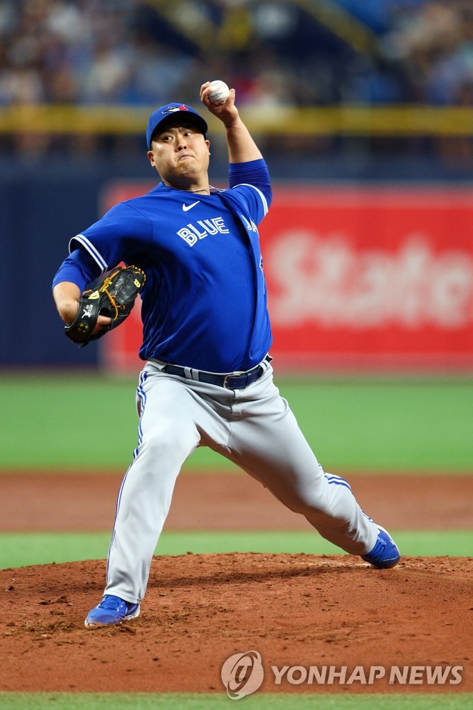 | ▲ In this USA Today Sports photo via Reuters from May 14, 2022, Ryu Hyun-jin of the Toronto Blue Jays pitches against the Tampa Bay Rays during the bottom of the second inning of a Major League Baseball regular season game at Tropicana Field in St. Petersburg, Florida. (Yonhap) |
