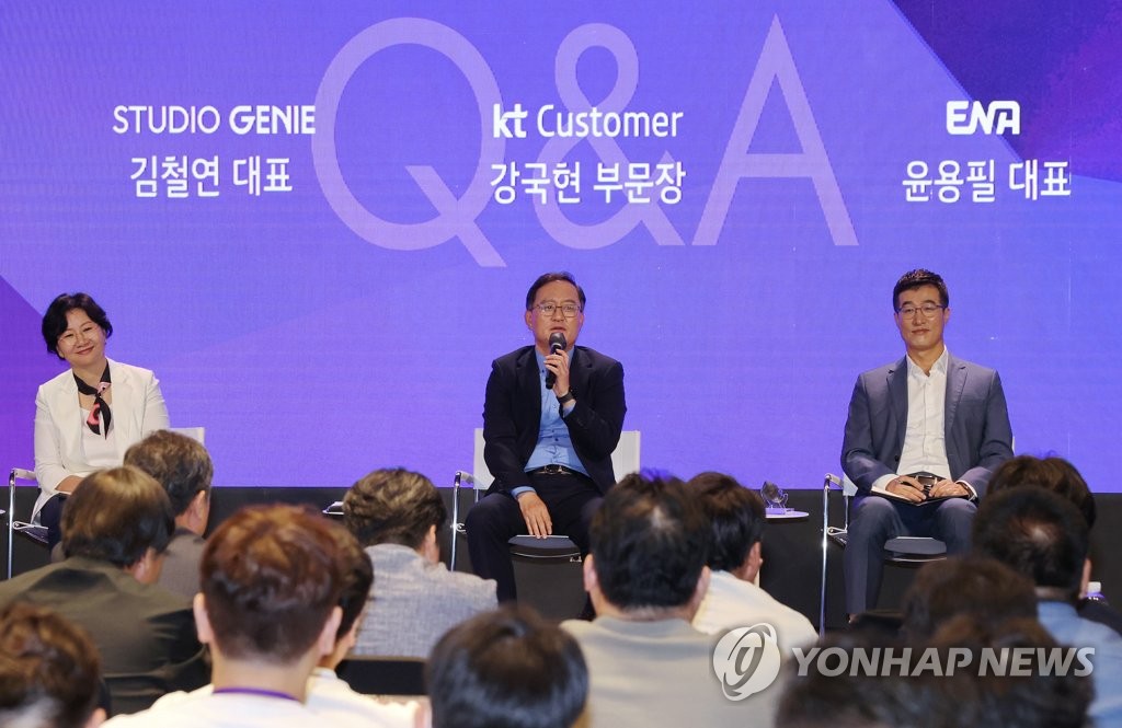 | ▲ KT, 2023 기자간담회 개최 (서울=연합뉴스) 이재희 기자 = 18일 오전 서울 중구 노보텔 앰버서더에서 열린 2023 KT 그룹 기자간담회에서 김철연 스튜디오 지니 대표(왼쪽부터), 강국현 KT 커스터머 부문장, 윤용필 ENA 대표가 취재진의 질문에 답하고 있다. 2023.5.18 scape@yna.co.kr |