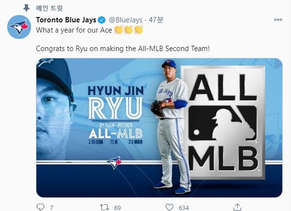 | ▲ 류현진의 '올 MLB 세컨드 팀' 선정을 축하한 토론토 구단 [토론토 블루제이스 구단 트위터 캡처. 재판매 및 DB금지] |