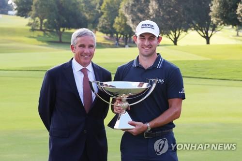 | ▲ 올해 PGA투어 플레이오프 우승자 패트릭 캔틀레이와 제이 모너핸 커미셔너. [AFP/게티이미지=연합뉴스] |