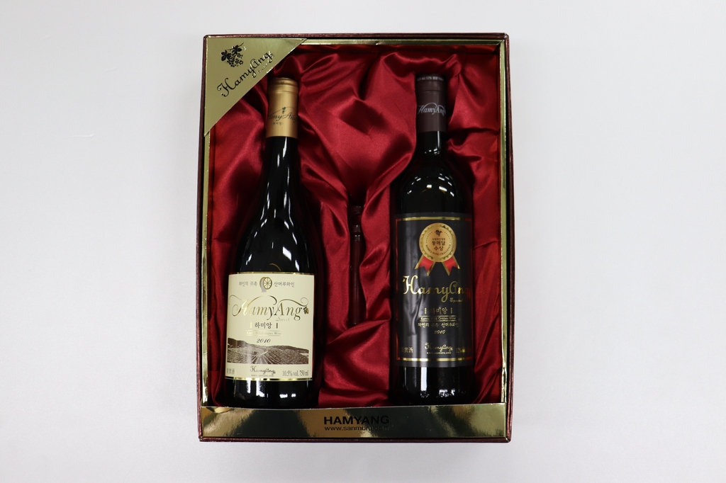 (함양=연합뉴스) 황봉규 기자 = 함양산삼항노화엑스포조직위원회는 농업회사법인 하미앙의 와인세트 제품이 함양산삼항노화엑스포 공식 인정상품으로 선정됐다고 11일 밝혔다.