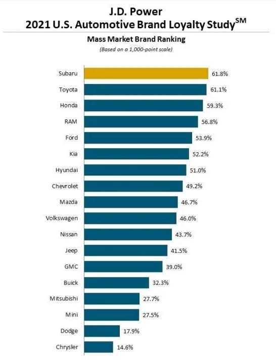 19일 업계에 따르면 제이디파워가 작년 6월∼올해 5월 거래 데이터를 기반으로 브랜드 충성도를 조사한 결과 일반 자동차 브랜드에서 일본 스바루가 61.8%로 3년 연속 1위를 차지했다.