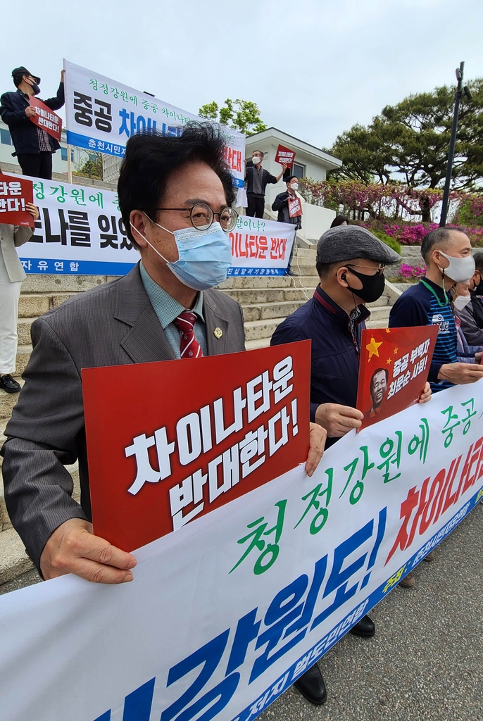 강원차이나타운저지범도민연합과 춘천시민자유연합은 21일 강원도청 앞에서 기자회견을 하고 중국복합문화타운 조성 계획 저지 및 최 지사 사퇴 촉구 범도민 집회를 했다.