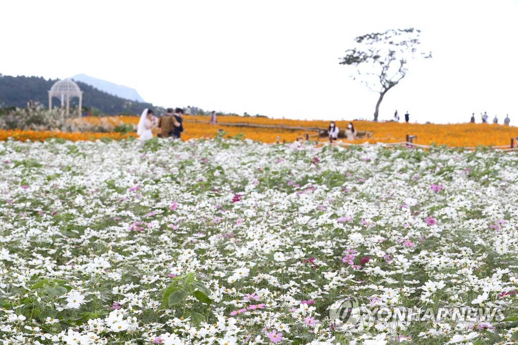 | ▲ 제주의 가을, 코스모스 '활짝' (서귀포=연합뉴스) 제주 서귀포시 안덕면 신화월드를 찾은 관광객이 코스모스가 활짝 핀 정원을 산책하고 있다. 2021.10.14 jihopark@yna.co.kr |