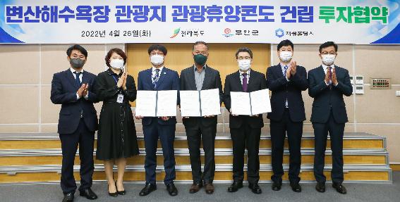 26일 전북도에 따르면 도와 부안군은 이날 자광홀딩스와 변산해수욕장에 관광휴양 콘도미니엄 건립을 뼈대로 한 투자협약을 맺었다.