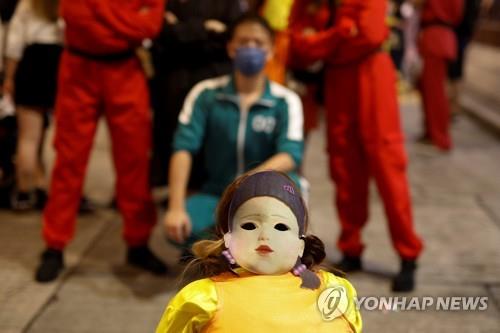 ▲ "어때요? 무섭나요?" (홍콩 AFP=연합뉴스) 지난 30일 밤 홍콩 유흥가 란콰이펑에서 열린 핼러윈 파티에 '오징어게임' 분장이 대유행했다. 2021.10.31. photo@yna.co.kr