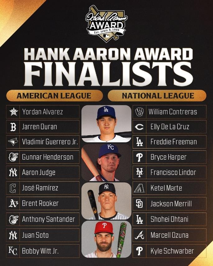 저지는 2022년에 이어 2년 만이자 통산 두 번째로 행크 에런상에 도전하며, 지난해 AL 수상자인 오타니는 리그를 바꿔 2년 연속 영예를 노린다.