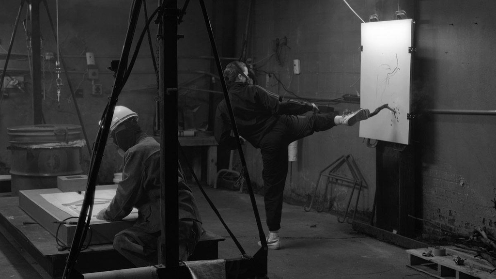 (서울=연합뉴스) 황희경 기자 = 좁은 주조소에서 한 여성이 작업용 마스크를 쓰고 움직인다. 여성은 주조소 안 용광로의 열에 나뭇가지 끝을 태워 그을린 나뭇가지로 벽에 걸린 종이에 자국을 그리고 태운다. 여성은 때로는 불에 그을린 나뭇가지를발에 묶고 종이에 자국을 남기기도 하면서 춤을 추듯이 움직인다. 한쪽에서는 역시 공업용 마스크를 쓴 남성이 회전공구를 들고 이 여성의 모습을 나무에 새긴다.