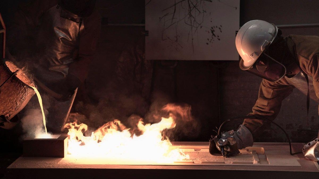 소리 없이 두 사람의 모습을 보여주는 28분짜리 영상은 주조소 직원들이 남성이 여성의 모습을 새기던 나무에 쇳물을 붓자 금속이 초상을 그린 선으로 흘러 들어가 나무를 태우고 불꽃이 주조소를 채우는 데서 절정에 이른다.