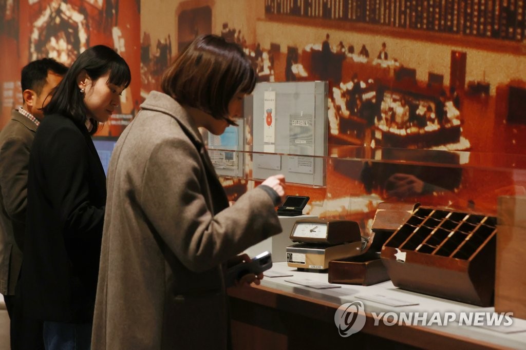 | ▲ 대한민국 주식의 역사 (서울=연합뉴스) 진연수 기자 = 2일 오전 서울 종로구 대한민국역사박물관에서 열린 개인과 가게의 자산 축적 역사를 주제로 한 특별전 '목돈의 꿈: 재테크로 본 한국 현대사' 기자설명회에서 참석자들이 전시를 관람하고 있다. 2023.3.2 jin90@yna.co.kr |