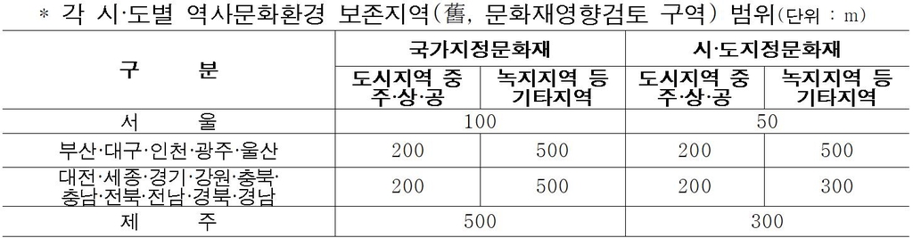 현재 서울과 제주를 제외한 대부분 지역에서 주거·상업·공업지역은 200m, 녹지지역 등은 500m(일부 시·도 지정문화재의 경우 300m)로 범위가 지정돼 있는데 문화재별로 설정 범위를 확인해 이를 조정하거나 축소한다는 것이다.