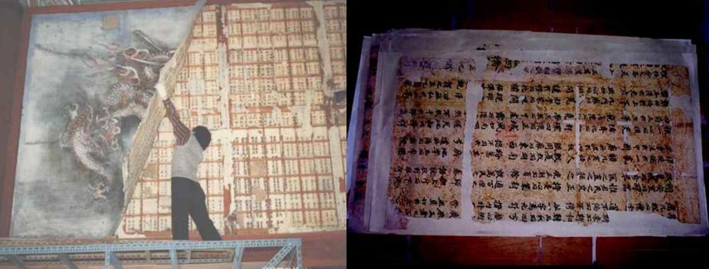 | ▲ 경복궁 사정전 쌍룡도벽화 뒷면(왼쪽)과 낙폭지 일부(오른쪽) [민족문화연구 97호에서 발췌, 재판매 및 DB 금지] |