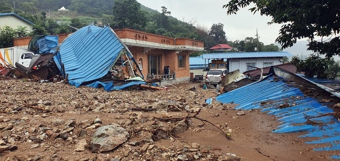 This photo, provided by a Yonhap News reader, shows the aftermath of overnight downpours that heavily damaged a village in Buyeo County, central South Korea. (PHOTO NOT FOR SALE) (Yonhap)
