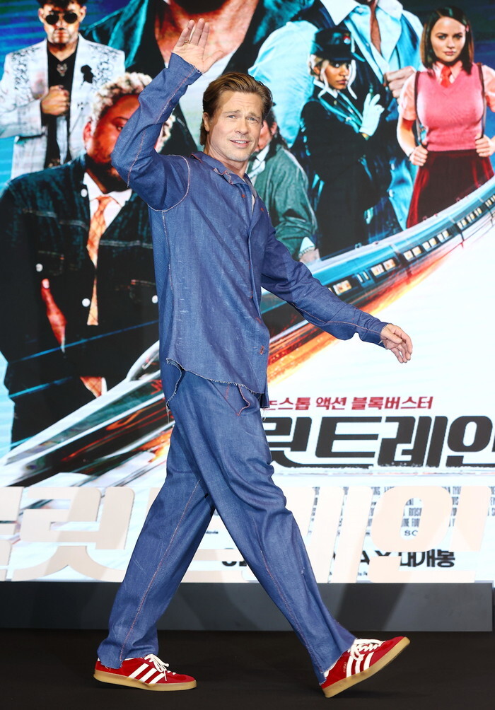 American actor Brad Pitt enters a news conference on his new film "Bullet Train" at a Seoul hotel on Aug. 19, 2022. (Yonhap)(END)
