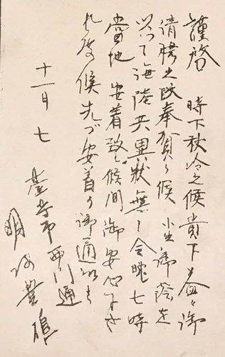 편지에는 "가을 날씨가 추워졌습니다. 그동안 여러모로 불편을 드렸습니다. 생활 속에 축복이 있기를 바랍니다. 소생은 선생 덕분에 바다와 육지 여행 길은 모두 별일 없었습니다. 안심하셔도 되겠습니다."라는 내용이 적혀 있다.