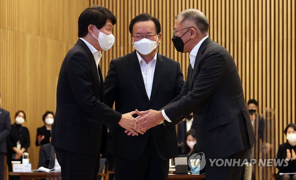 | ▲ Labor minister An Kyung-duk (L) shakes hands with Hyundai Motor Group Chairman Chung Euisun as Prime Minister Kim Boo-kyum (C) watches them during the Youth Hope ON event at Hyundai Motor Studio in Goyang, northwest of Seoul, on Nov. 22, 2021. (Yonhap) |