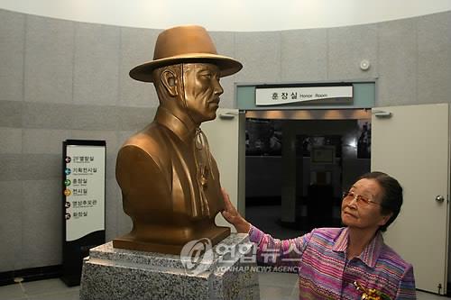 | ▲ 할아버지 동상 보는 허로자 여사 (구미=연합뉴스) 손대성 기자 = 지난 2009년 9월 28일 경북 구미에서 열린 왕산기념관 개관식에서 항일의병장 왕산 허위(許蔿.1854~1908년) 선생의 장손녀인 허로자 여사가 할아버지 동상을 올려다보고 있다. |