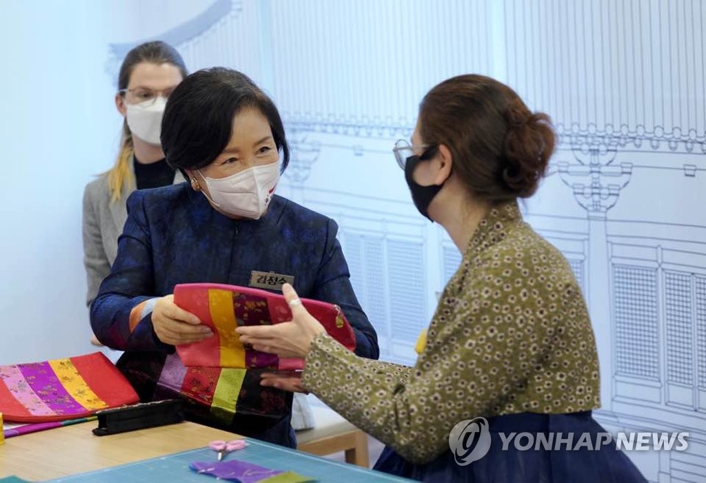 | ▲ 조각보 강좌 수강생과 대화하는 김정숙 여사 (부다페스트=연합뉴스) 최재구 기자= 헝가리를 국빈방문 중인 문재인 대통령 부인 김정숙 여사가 4일 오전(현지시간) 헝가리 한국문화원을 방문해 조각보 강좌 수업을 마친 뒤 수강생들에게 짜투리 천과 골무, 실패를 담은 반짇고리를 선물하고 있다. 2021.11.4 jjaeck9@yna.co.kr |