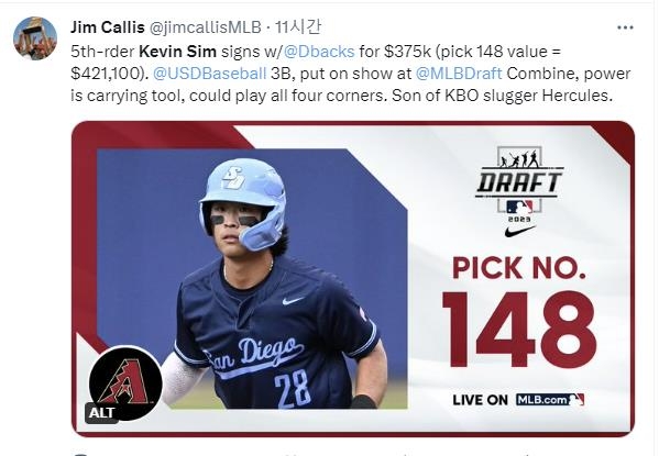 케빈 심은 지난 11일 MLB 드래프트에서 5라운드 전체 148순위로 애리조나에 지명됐다.