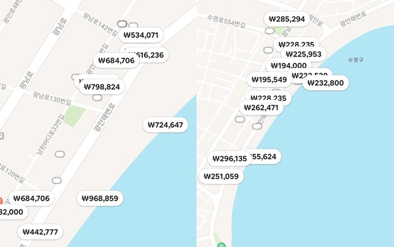이날 광안리 해수욕장 일대 공유숙박업소 시세는 40만원에서 많게는 90만원까지 판매가 되고 있다.