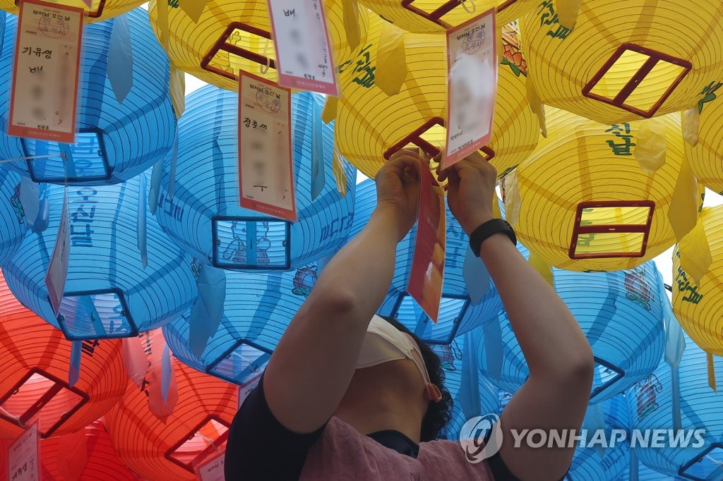 | ▲ 연등에 달리는 축원 꼬리표 (서울=연합뉴스) 신현우 수습기자 = 불기 2566년 부처님오신날인 8일 오전 서울 종로구 조계사에서 행사 진행요원이 연등에 축원 꼬리표를 달고 있다. 2022.5.8 nowwego@yna.co.kr |