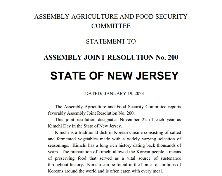 (뉴욕=연합뉴스) 고일환 특파원 = 미국 동부의 뉴저지주(州) 하원이 매년 11월 22일을 김치의 날로 기념하자는 결의안을 가결했다.