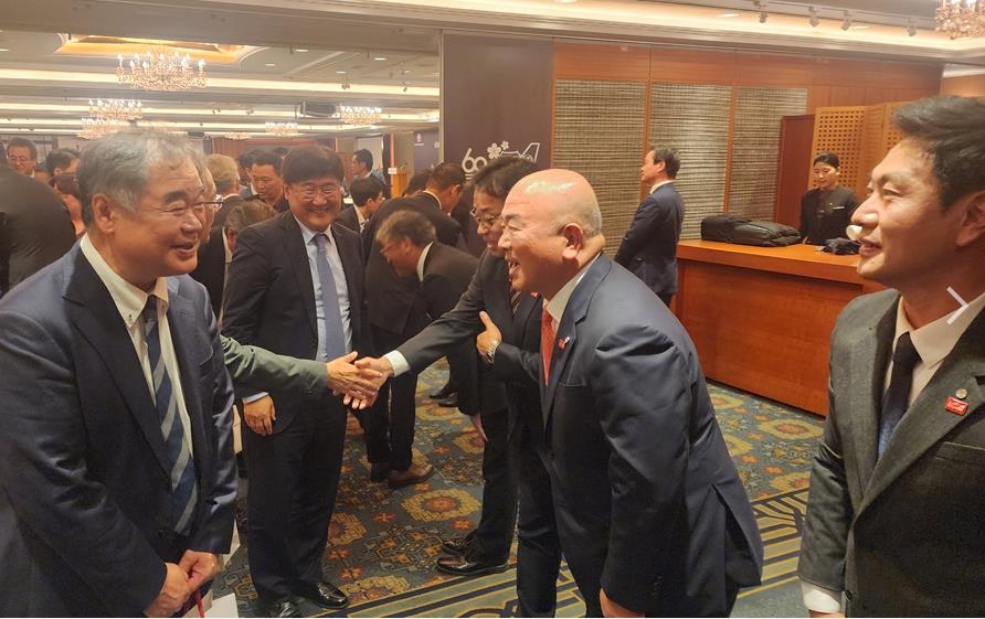 | ▲ 한국 관광·항공업계 관계자와 인사하는 시미즈 신이치로 JAL 부회장(가운데). [사진/성연재 기자] |