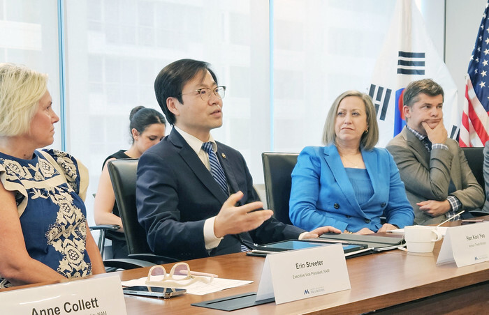 South Korean Trade Minister Yeo Han-koo (2nd from L) speaks during a meeting with representatives from the U.S. National Association of Manufacturers in Washington, D.C., on July 8, 2025, in this photo released by the South Korean industry ministry. (PHOTO NOT FOR SALE) (Yonhap)