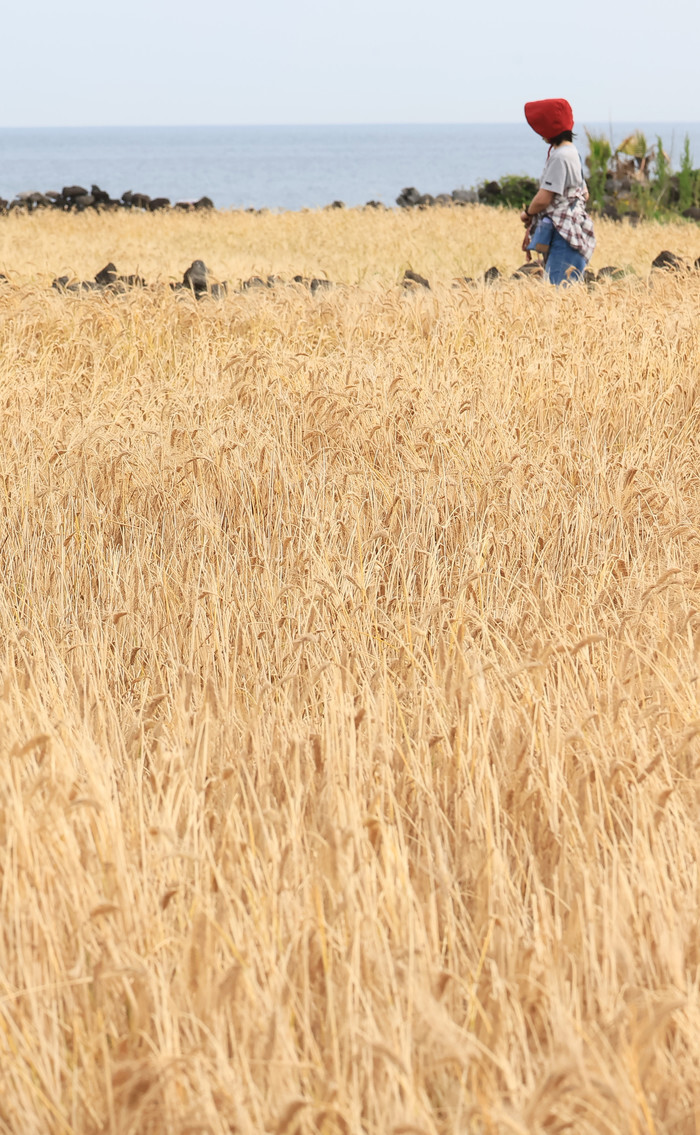 A woman walks through a barley field in Jeju on May 11, 2024, amid forecasts of rain nationwide. (Yonhap)