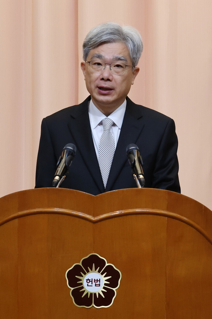Kim Sang-hwan, chief justice of the Constitutional Court, addresses a ceremony to mark the start of business for the new year at the court in Seoul on Jan. 2, 2026. (Yonhap)