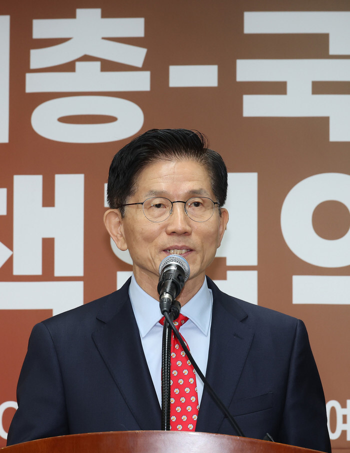 Kim Moon-soo, the presidential candidate of the conservative People Power Party, speaks during a meeting with representatives of the Confederation of Artistic and Cultural Organizations in Seoul on May 20, 2025, to form a pact on art and culture-related policies, ahead of the June 3 presidential election. (Yonhap)