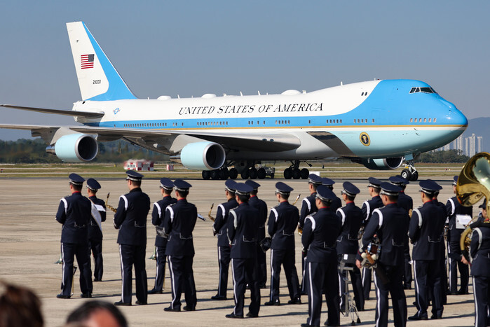 Air Force One lands at Gimhae airport in the southeastern port city of Busan on Oct. 29, 2025, as U.S. President Donald Trump visits South Korea for this year's summit of the Asia-Pacific Economic Cooperation forum in the nearby city of Gyeongju. (Yonhap)
