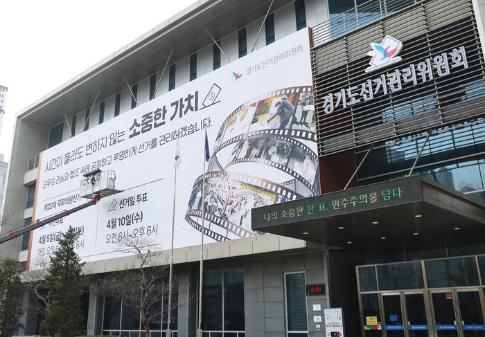 A banner promoting voter participation in the upcoming general elections is hung on the outer wall of the Gyeonggi provincial election management commission in Suwon, 30 kilometers south of Seoul, on Feb. 27, 2024. The polls, set for April 10, are to elect 300 lawmakers. (Yomnhap)