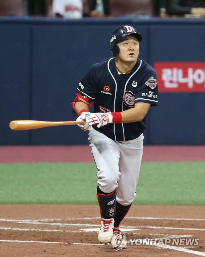 | ▲ In this file photo from Nov. 23, 2020, Choi Joo-hwan, then of the Doosan Bears, watches his double against the NC Dinos in the top of the second inning of Game 5 of the Korean Series at Gocheok Sky Dome in Seoul. (Yonhap) |