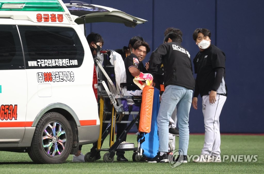 | ▲ KT Wiz second baseman Park Kyung-su is placed in an ambulance after suffering a leg injury during the bottom of the eighth inning in Game 3 of the Korean Series against the Doosan Bears at Gocheok Sky Dome in Seoul on Nov. 17, 2021. (Yonhap) |