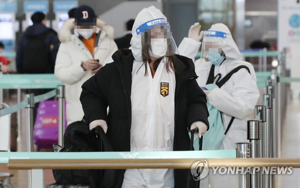 | ▲ Passengers clad in protective gear wait at a check-in counter in the departure lobby of the Incheon airport, west of Seoul, amid the coronavirus pandemic on Jan. 14, 2021, before they fly to the eastern Chinese city of Yantai. (Yonhap) |