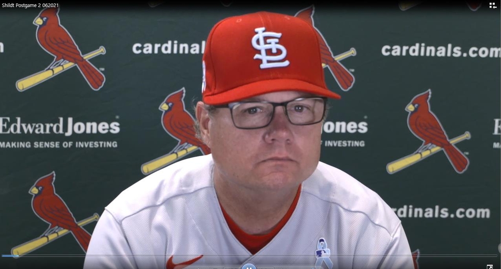 | ▲ 화상 인터뷰하는 실트 감독 (서울=연합뉴스) 마이크 실트 세인트루이스 카디널스 감독이 21일(한국시간) 미국 조지아주 애틀랜타의 트루이스트파크에서 열린 2021 미국프로야구 메이저리그 애틀랜타 브레이브스와의 더블헤더가 끝난 뒤, 화상 인터뷰하고 있다. [세인트루이스 카디널스 화상 인터뷰 캡처. 재판매 및 DB금지] |