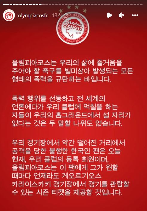 올림피아코스는 16일(이하 한국시간) 구단 사회관계망서비스(SNS)에 그리스어, 영어, 한국어 순으로 성명을 올려 "우리의 삶에 즐거움을 주어야 할 축구를 빌미 삼아 발생하는 모든 형태의 폭력을 규탄한다"고 밝혔다.