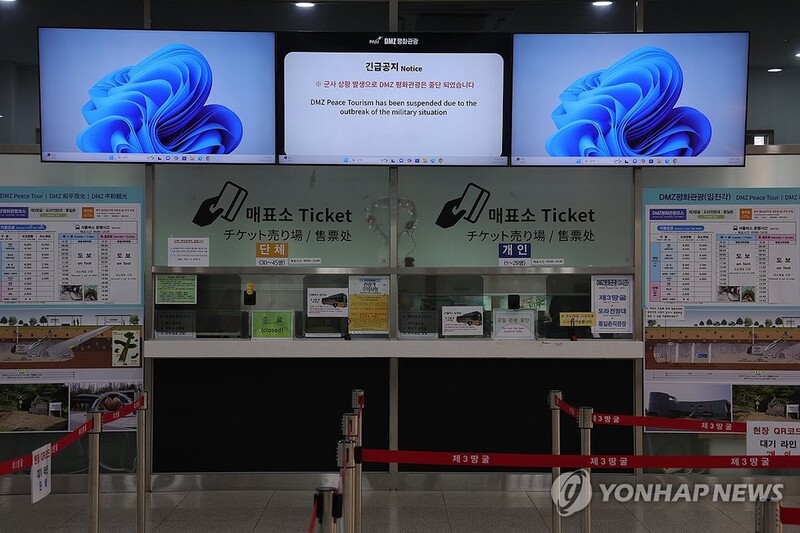 | ▲ '텅 빈 매표소' 중단된 안보 관광 (파주=연합뉴스) 임병식 기자 = 북한이 경의선·동해선 남북 연결도로 일부 구간을 폭파한 15일 오후 경기도 파주시 임진각에서 안보 관광을 중단한다는 긴급 공지가 나오고 있다. 2024.10.15 andphotodo@yna.co.kr |