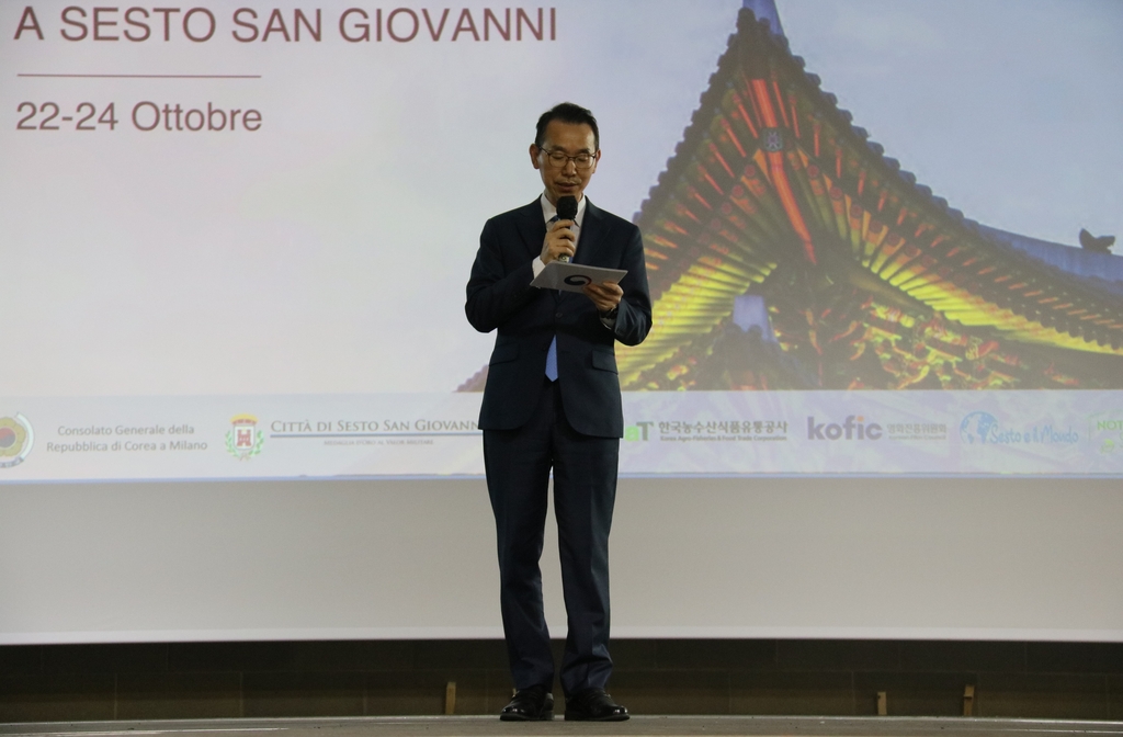 ▲ 축사하는 강영식 주밀라노 총영사 (밀라노=연합뉴스) 전성훈 특파원 = 밀라노 인근 세스토 산 조반니에서 24일(현지시간) 열린 케이팝 페스티벌 개막 전 강형식 주밀라노 총영사가 축사하고 있다. 2021.10.24. photo@yna.co.kr